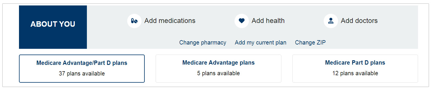 In most cases you will want to stay in the default setting which is for Medicare Advantage Plans/Part D Plans. These are the plans which include your drug coverage. The second button of Medicare Advantage plans without the Part D included, are for those who are getting their prescription drugs through the Veterans Administration and do not require their Medicare Advantage plan to include drug coverage.